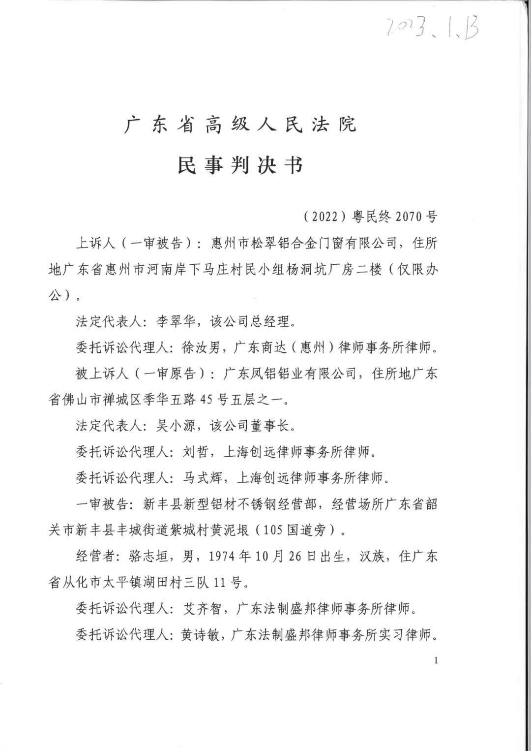 近日,上海慧众律师事务所辉知队收到广东省高级人民法院(2022)粤民终2070号判决,惠州市松翠铝合金门窗有限公司与广东凤铝铝业有限公司、新丰县新型铝材不锈钢经营部、江西普诺德铝业有限公司、江西辉煌铝业有限公司侵害商标权及不正当竞争纠纷一案现已审理终结。